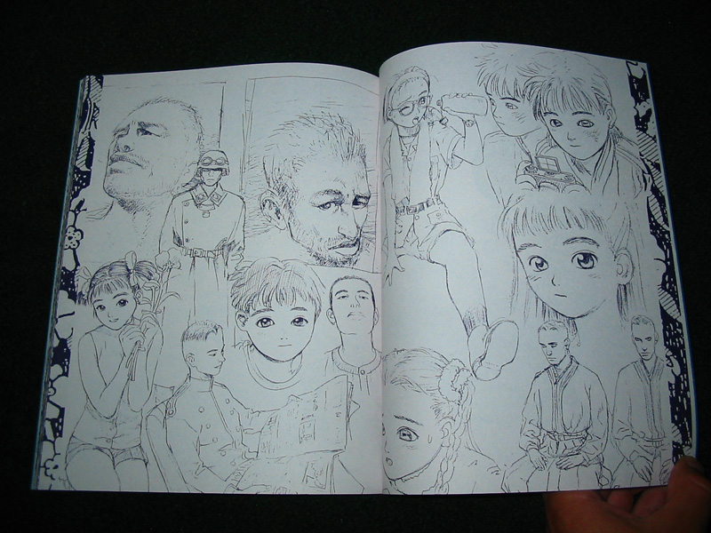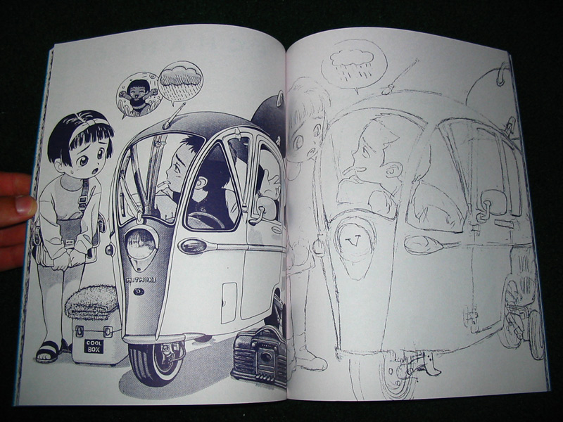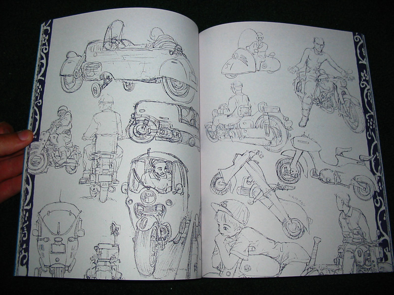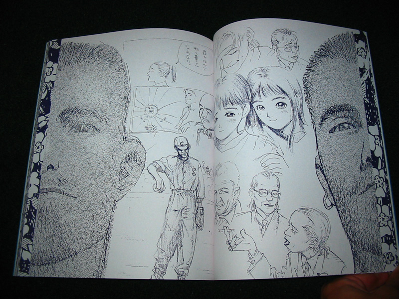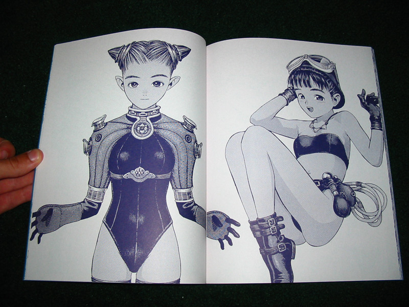 Details: This is the third edition of Futsutsuka. The first print was sold on 01/01/1993 and the second was released a year later on 01/01/1994. The majority of the book is presented in a stlye of a rough sketch book: many of the pages contain collages of random character and mechanical sketches. While many of the pages have strictly character-related drawings, there are a number of Murata's outlandish car and motorbike designs present. Artist notes are scattered throughout the book, but most of the pages lack descriptions. Few pages are devoted to single portraits. The pages are fairly thick and the ink has a dark navy blue hue. Futsutsuka is a interesting doujinshi when compared to Murata's more modern work because you can really tell how refined his work has grown throughout his career.