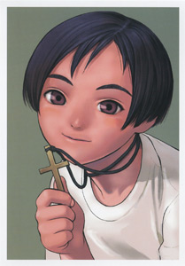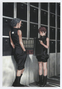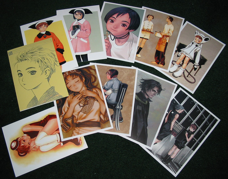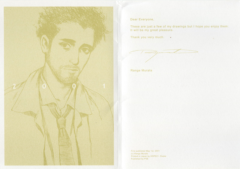 Details: This special set of 10 postcards was licensed by Fanboy Entertainment for release at Anime Central 2001 in Illinois. All of the artwork is from Murata's previous works and doujinshi releases, such as Marion and Company, The Missing, and an egg story. The cards are presented in a small paper folder with a special sketch and brief [very brief] English message from Murata.