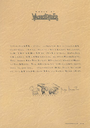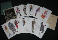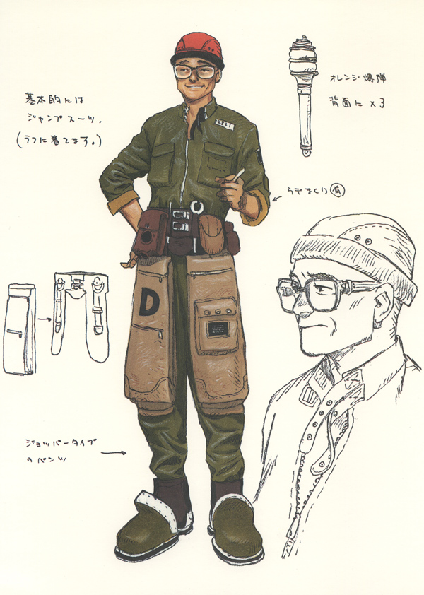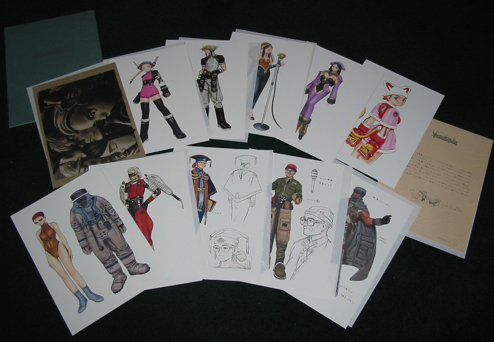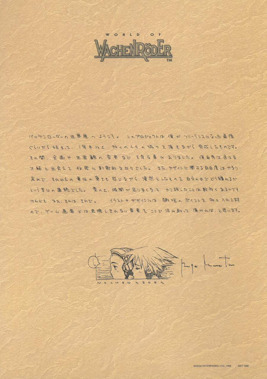 Details: World of Wachenröder includes a pleasant variety of poster images featuring characters from the video game release of Wachenröder. The first image is an olive green-toned black and white-esque group illustration from the game's cover artwork and the remainder feature single characters. Three of these feature some accompanying line sketches and notes, but the other seven are the trademark style of single characters on white backgrounds. The last sheet contains a short message from Murata and a copy of his signature.