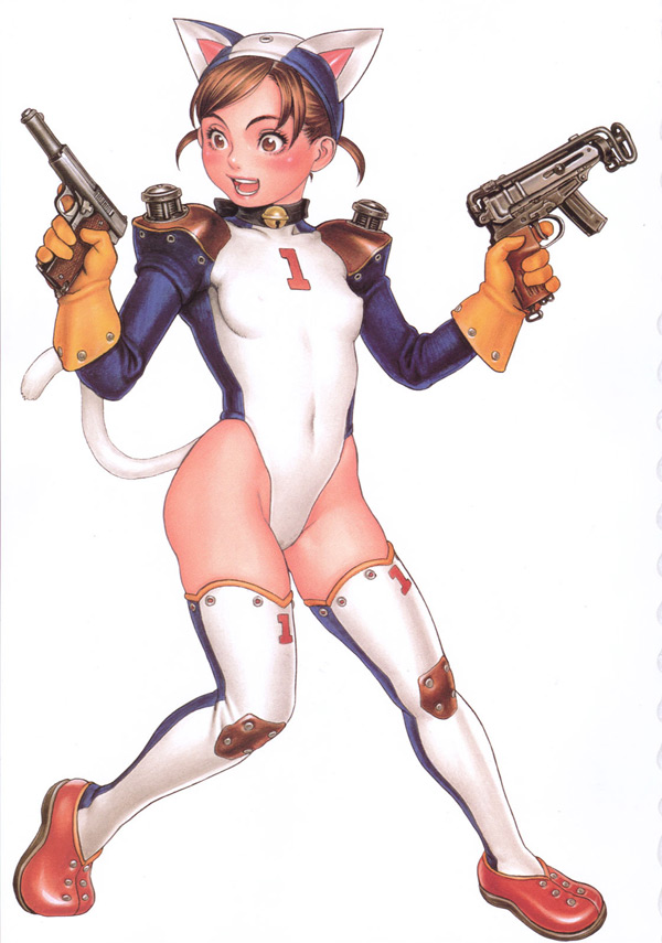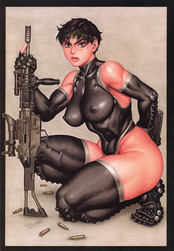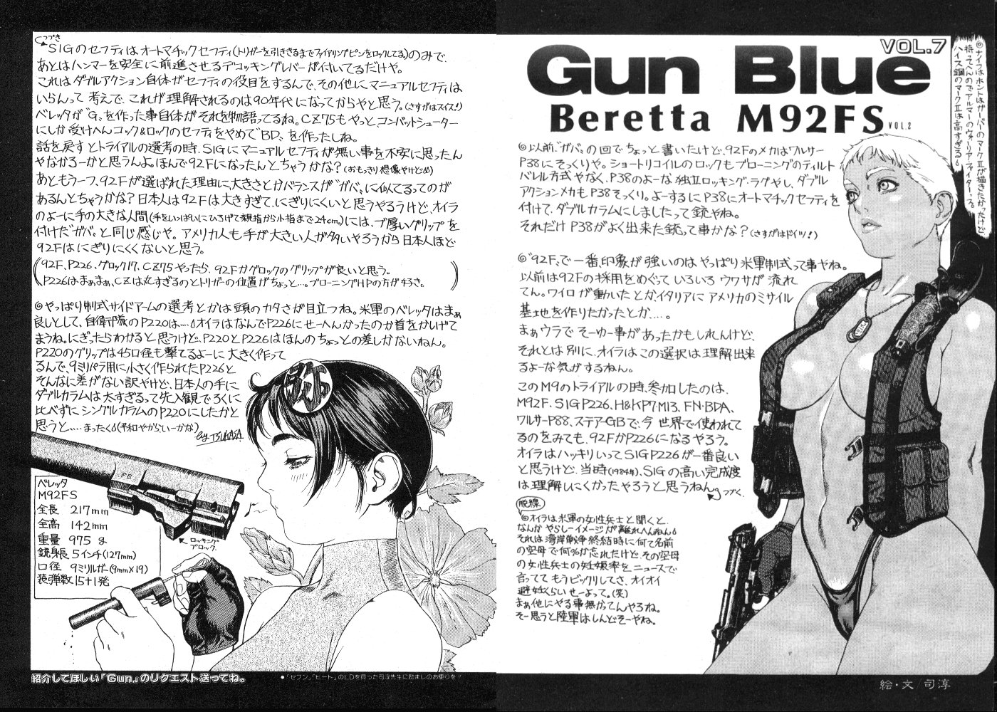 Gun Blue is a comic by Tsukasa that was serialized in Comic Gamest magazine. Each edition of the comic consists of a few pages that talk about a specific firearm, complete with Tsukasa's trademark detailed drawings (of both the firearms and of the characters who often model them). One of the sections in this book is a more traditional manga chapter that focuses on the Government M1911A1 and stars original character Yayoi and Tsukasa himself (in his usual daruma form). The pictured color illustration is a pin-up that was featured in the magazine.